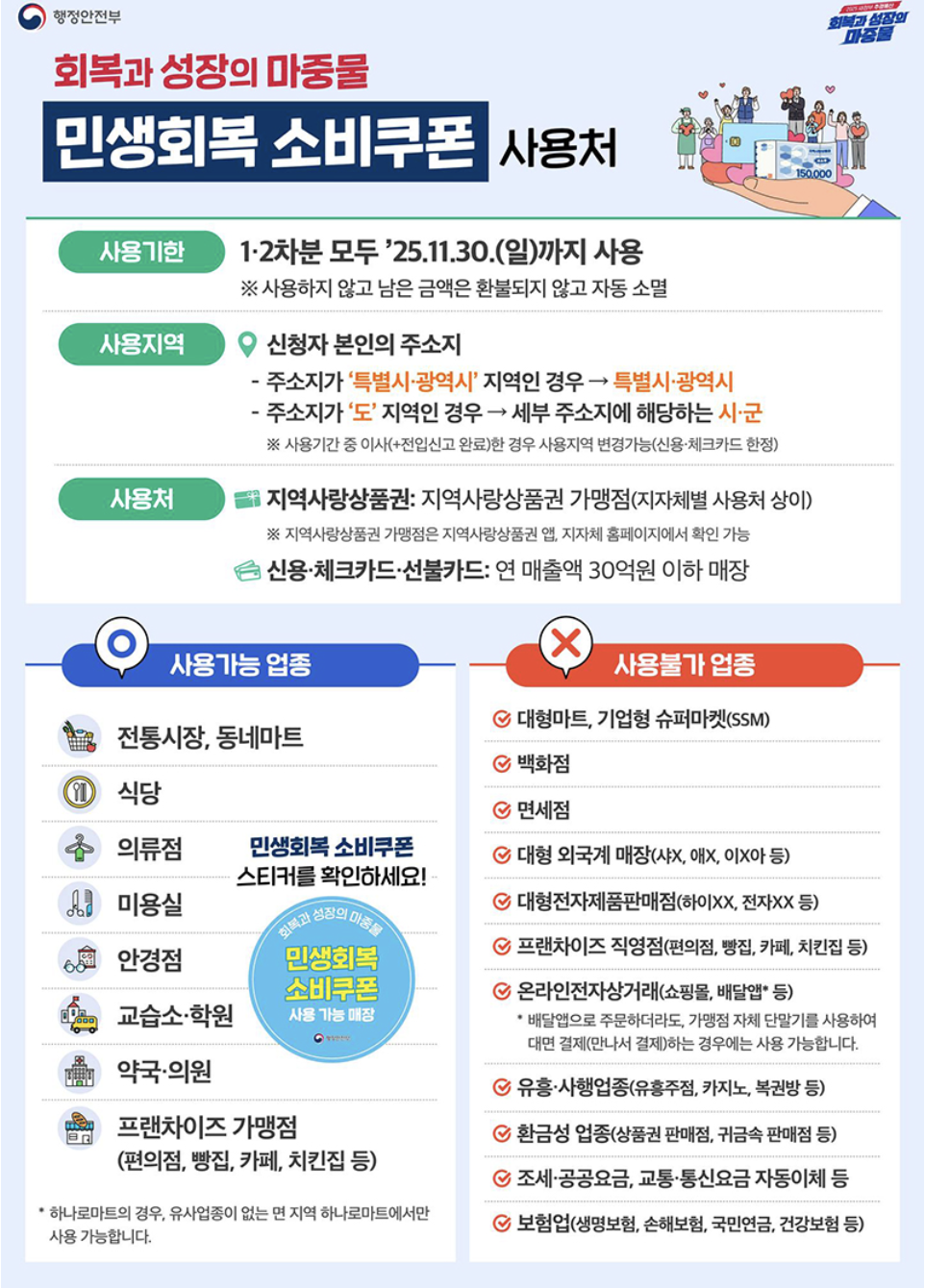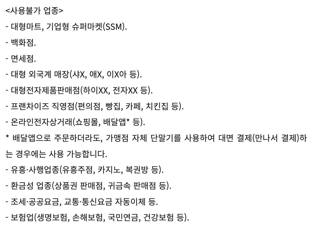 다만 대형마트, 백화점, 면세점, 온라인 쇼핑, 유흥·사행업종, 환금성 업종 등에서는 사용이 불가합니다.