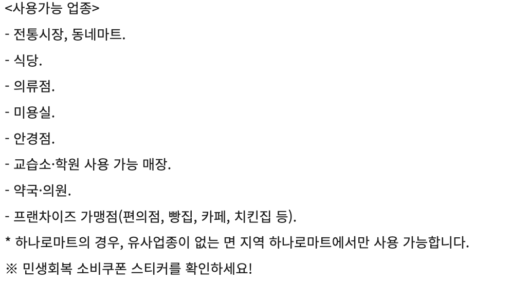 사용 가능 업종은 연 매출 30억 원 이하의 동네 상점, 전통시장, 식당, 의류점, 미용실, 학원, 약국, 편의점 등으로,