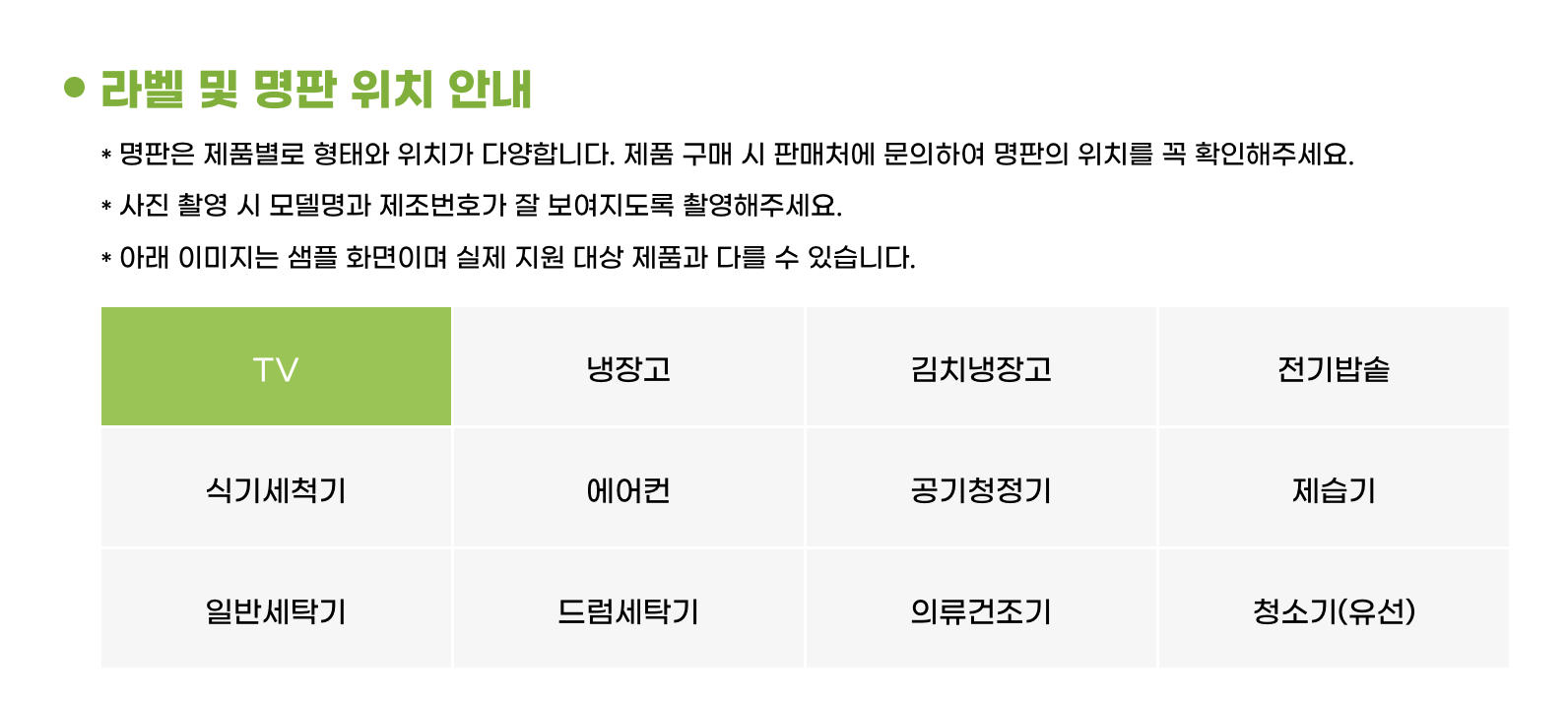 명판 사진 또는 에너지 소비 효율 등급 라벨 사진이 필요합니다.