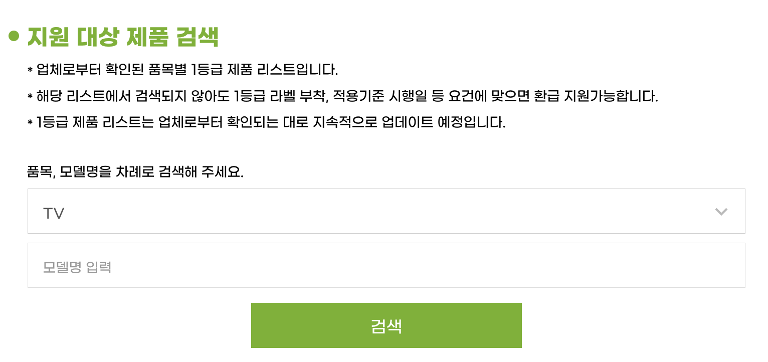 기본적으로 본 사업의 환급 대상은 에너지 소비 효율 등급 중 최고 등급에 해당하는 가전제품입니다.